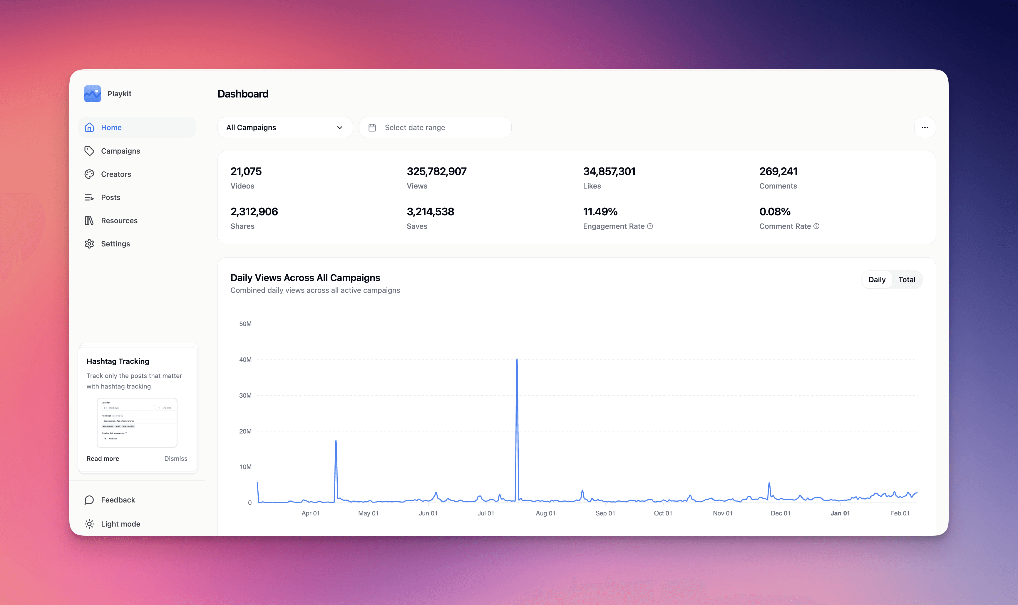 Here's the data that makes this clear: at Playkit, we've posted over 69,000 videos and driven 755M+ views across 50+ campaigns. Our viral videos (500K+ views) accounted for over half of total views while making up just 0.3% of total videos posted.